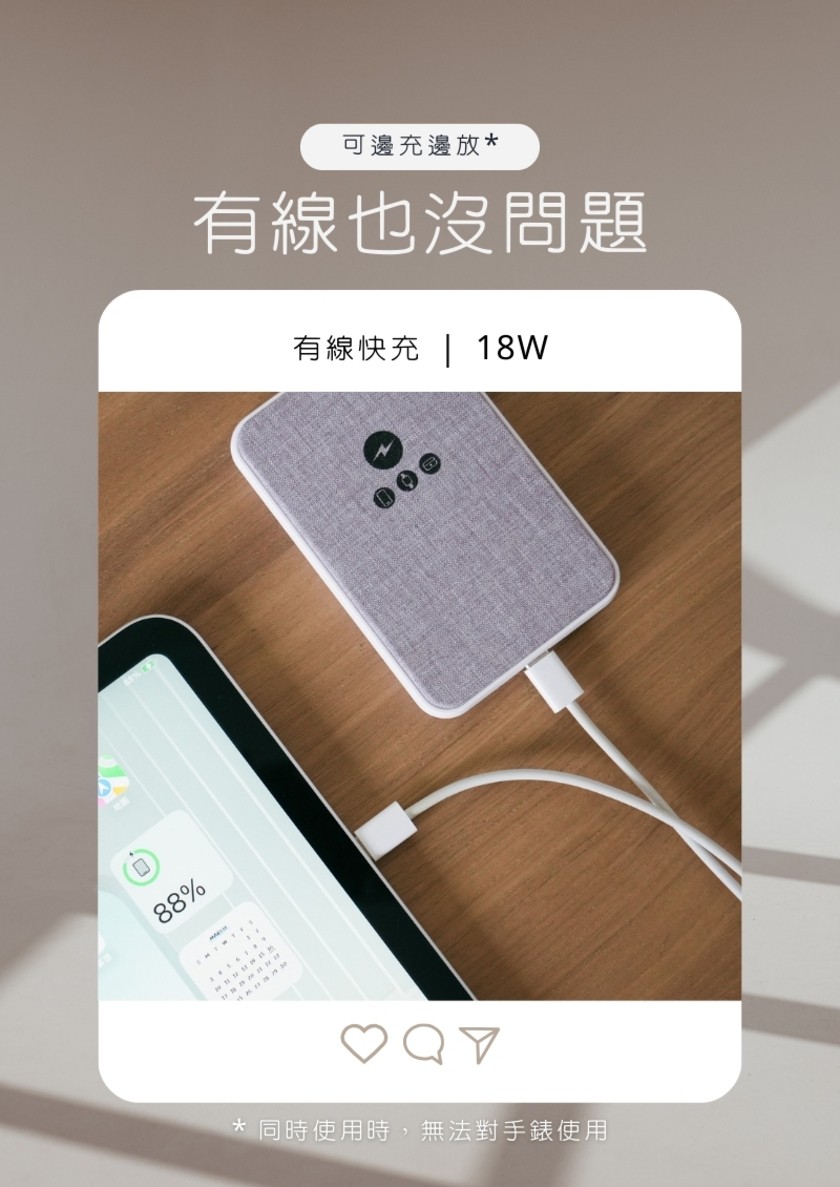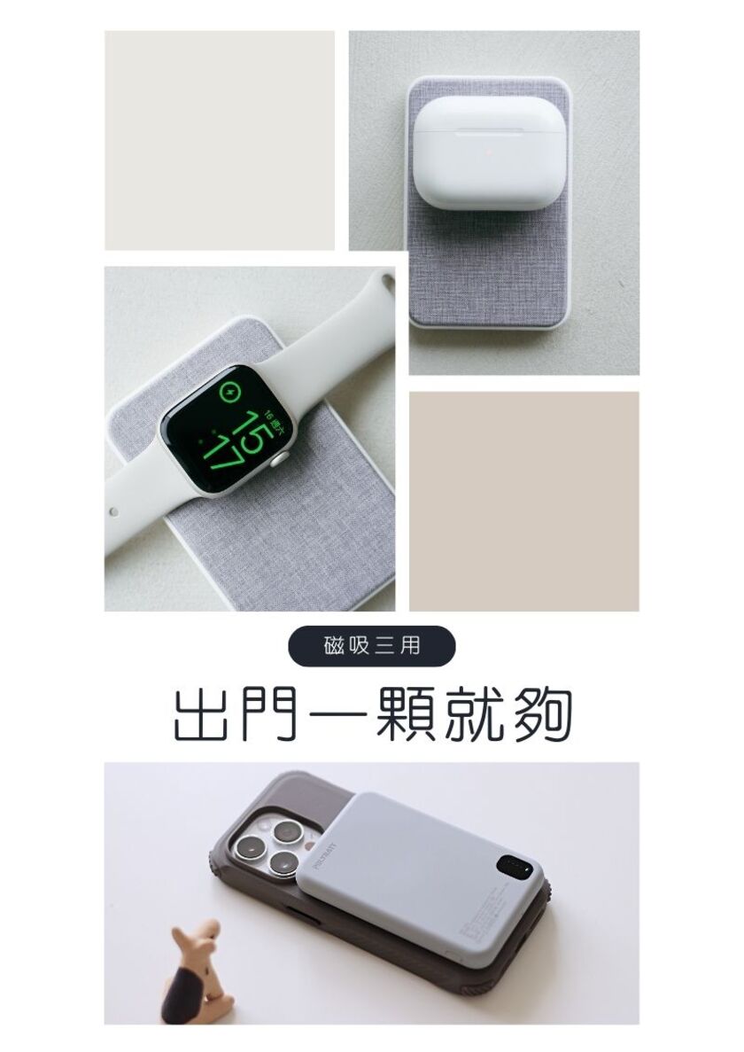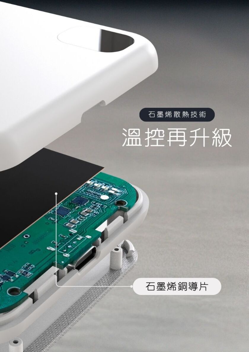 「置入石墨烯銅導片」,透過非常優秀的「水平熱傳導」 -不同以往的單點散熱,迅速將熱源向外擴展,以達到優良散熱效果,更加保護電池 -不卡鏡頭,相容MagSafe -置入新型特殊充電線圈結構,讓你三用轉換充:蘋果手機、安卓手機、AppleWatch、AirPods -輸出皆快充,無線15W MAX/有線18W MAX(由於此款產品無MFM認證,因此iPhone無線充電輸出為7.5W) -輕薄好攜帶,厚度/寬度適中,重量僅131g,放入口袋即刻出發 -超極好握感,嚴選高品質耐磨布料、親膚性表面特殊塗裝