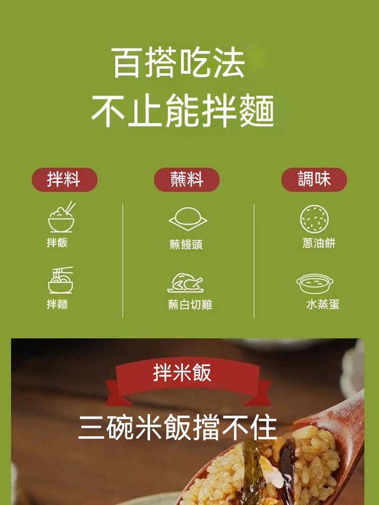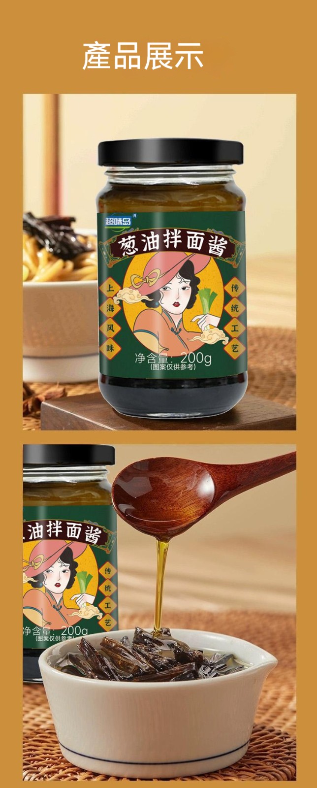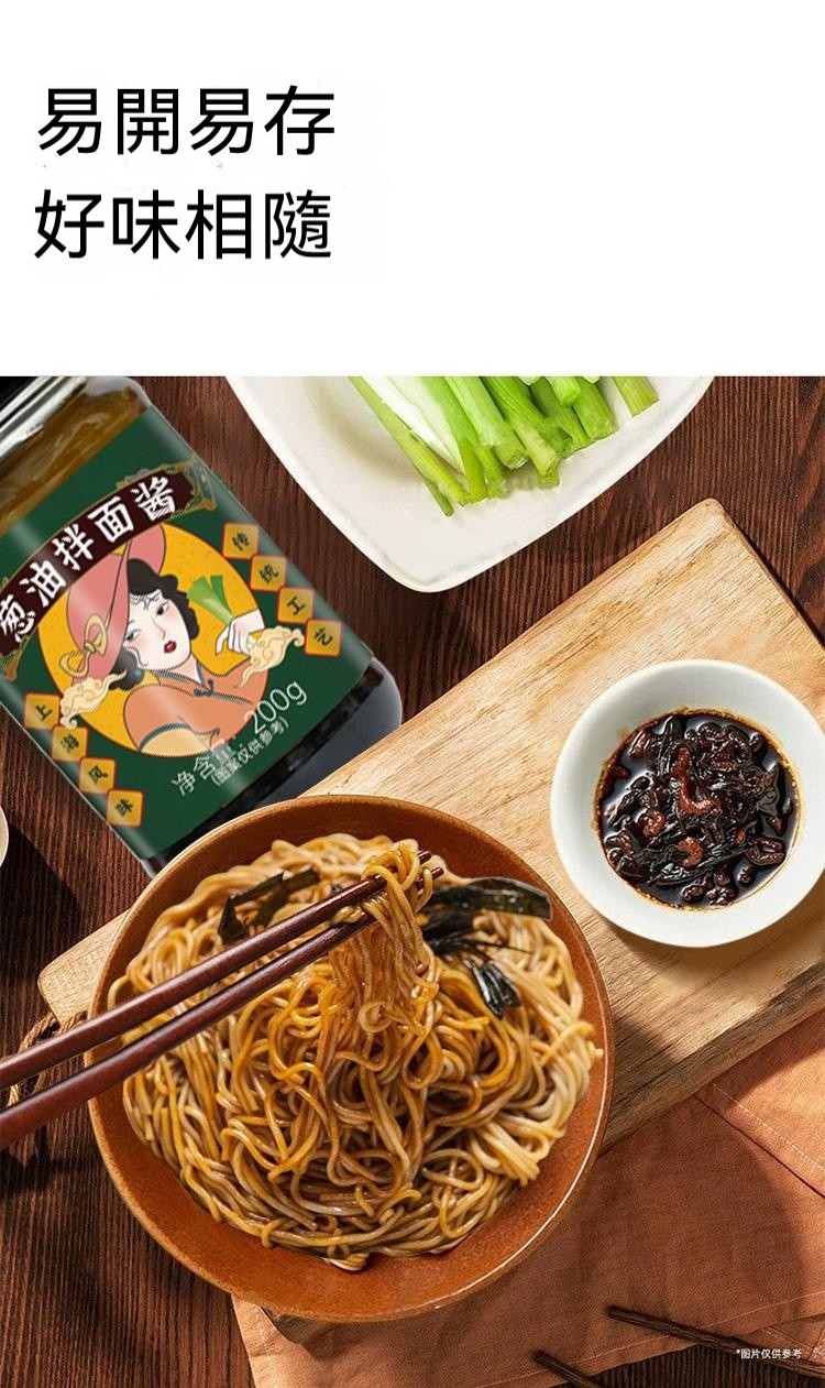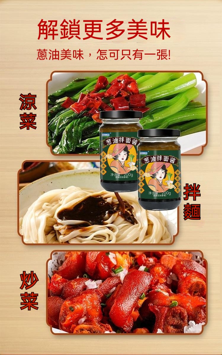 4分鐘前醇厚麵醬,完美搭配麵食,展現獨特風味 ,五分鐘就能吃上的蔥油拌面 ,無需繁瑣步驟 ,開瓶即食 油潤蔥香即刻享用 ,增鮮提香 ,秒變大廚 ,飯或者面都能一勺搞定 - 【划算裝】8入組-NT$1580