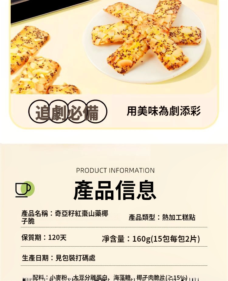 5分鐘前奇亞籽紅棗山藥椰子薄脆 - 【超值囤貨】買三送三 箱裝 NT$1398